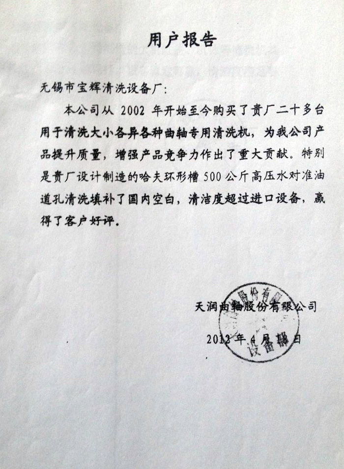 關(guān)鍵詞:天津曲軸股份有限公司用戶報(bào)告  發(fā)布日期:2015-03-05  來源:安徽寶輝清洗設(shè)備制造有限公司