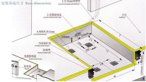 ●預(yù)埋管在地坑外的走向,由客戶視按鈕安裝位置,動力電源接線盒位置決定管路走向。